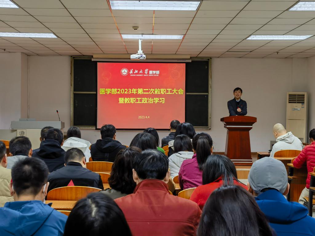 4月4日下午,医学部在14教南410会议室召开2023年第二次教职工大会暨教职工政治学习会议。会议由医学部党委书记关辉主持,学校机关党委书记周锦华、宣传部科长张晨露及医学部全体教职工参与本次会议。