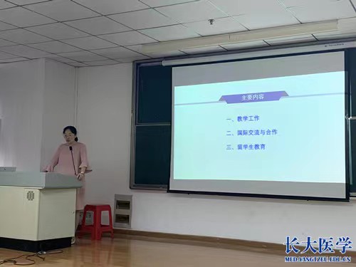 副院长胡娅从“教学工作”、“国际交流与合作”、“留学生教育”三个方面对医学部上半年教学工作情况进行汇报。