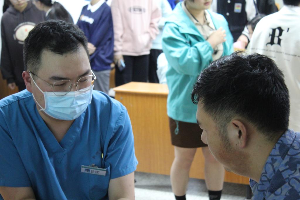 义诊环节,现场被分为皮肤区域和运动康复区域,在场同学井然有序地在自己感兴趣的区域排起队伍,参与义诊,活动现场氛围热烈。