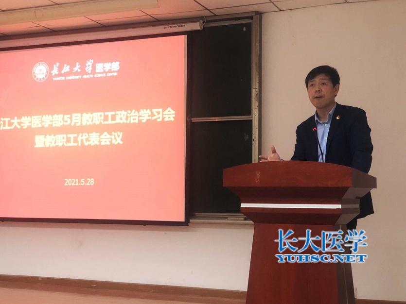 (通讯员 张渊 王喆)5月28日下午,医学部5月教职工政治学习会暨教职工代表会议,会议在14教410会议室举行,医学部全体教职工参加会议,会议分三个阶段进行,会议由党委书记关辉主持。