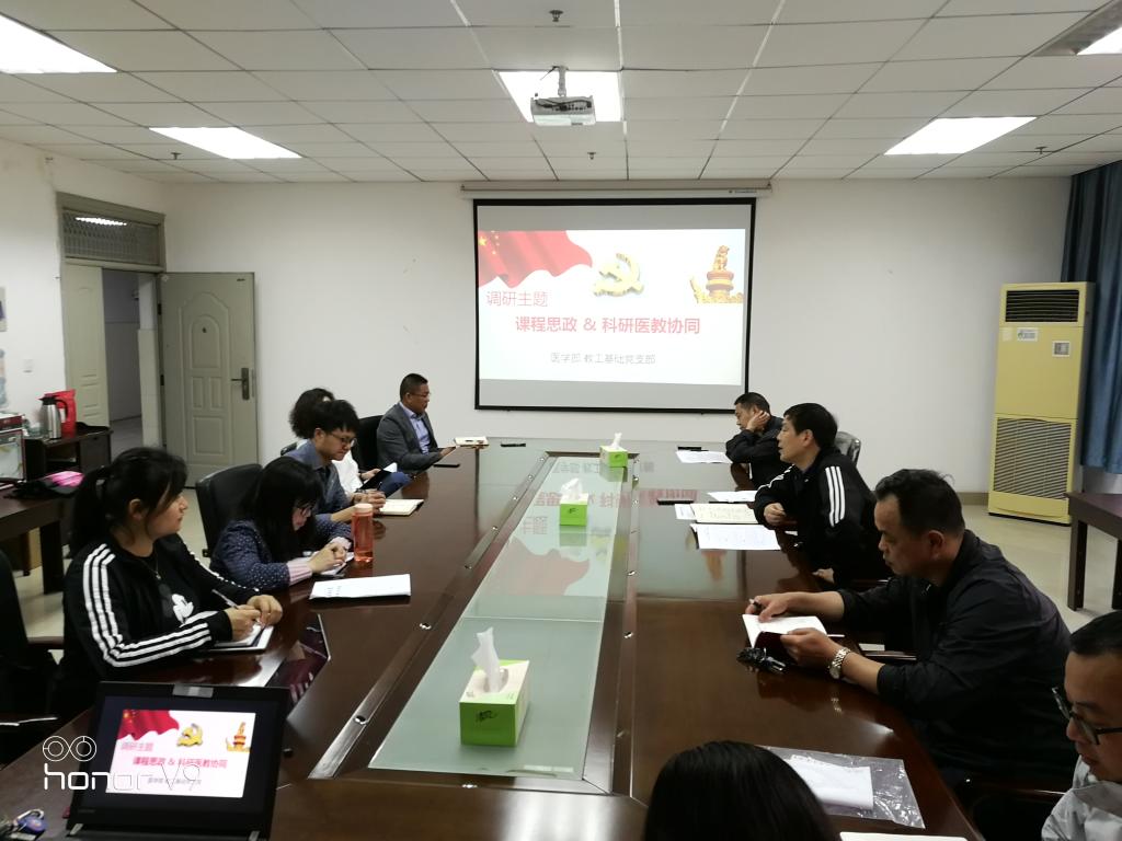 (通讯员 杨飞)5月6日下午,医学部党委书记关辉、副院长陈晓光到教工基础党支部开展课程思政工作和科研医教协同调研。会议由支部书记马兆武主持,基础教工党支部全体教师党员参加会议。