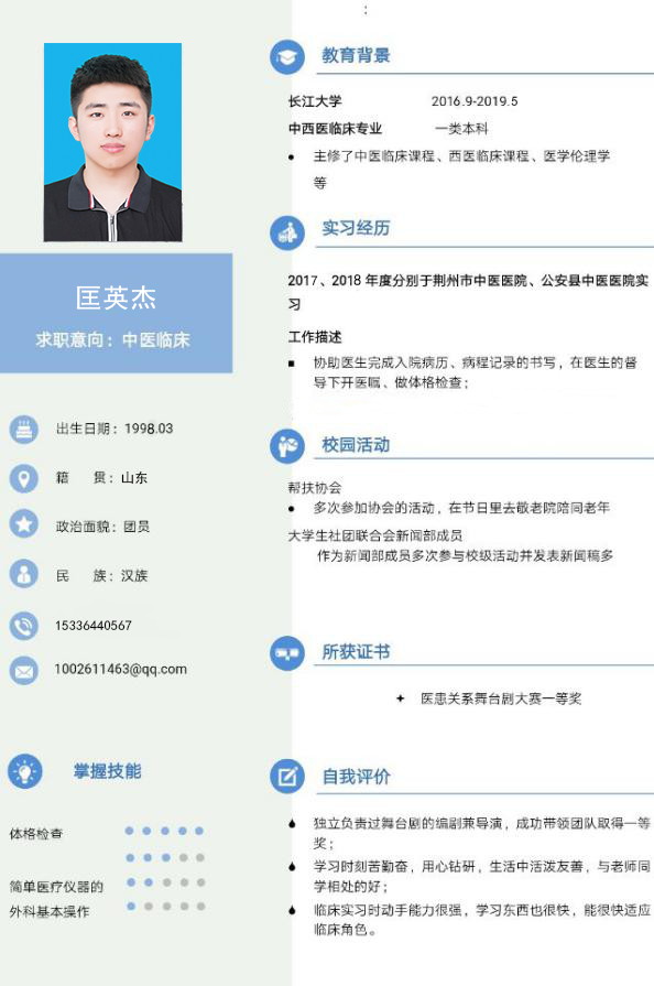(通讯员:张洋)2019年5月5日至5月27日医学部召开简历制作大赛。本次活动以在校大学生如何设计一份优秀具有竞争力的求职简历为活动形式,指导医学部学生赢在求职的起跑线上并能在竞争激烈的求职路上脱颖而出。首先每位选手都要在规定时间展示其简历亮点,选手们使出浑身解数以期打动评委,评委们很严苛地提出一些职场问题,对选手们“毫不留情”,在紧张与激烈的“交火中”,选手们出色地完成了自己的简历介绍。之后,评委们对选手的比赛态度给予了肯定,并对选手们的简历一一做了精确点评。并表示简历当以一页简练美化为更好,更能集中表现自己的能力与才干;一个明确的求职目标是你赢得成功的关键;注重简历内容与求职意向的相关性,更能发挥简历的作用。比赛进行到这个时候,选手们已经忘却比赛的紧张,而是更多的互相学习,同步提升。经过激烈角逐,中西医临床11601王亚东,中西医11602匡英杰,李可盈分获第一、二、三等奖。