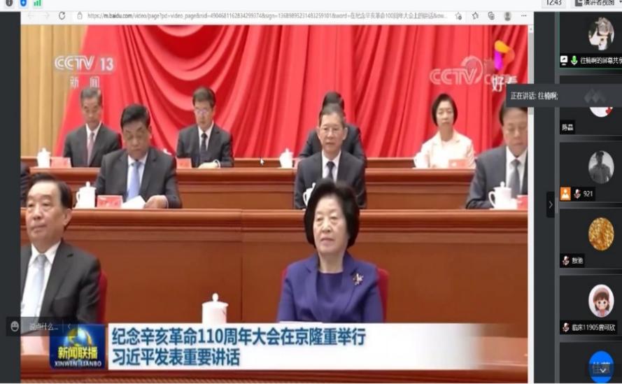 临床11905班和临床11907班等班级采用线上会议的方式,主要通过网络直播回放、权威网站等学习内容,重温习近平总书记在纪念辛亥革命110周年大会上的讲话精神,深化同学们对辛亥革命的认识。