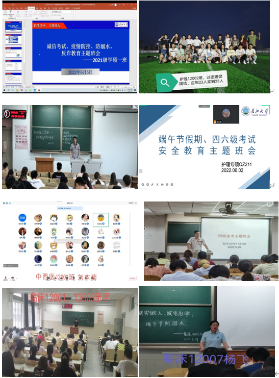 各班利用晚自习、周四查寝、周末晚点名机会,播放安全教育微视频,集中学习防溺水安全常识,严禁学生私自外出,杜绝学生近水活动,扎实开展防溺水安全教育;引导各班同学学习国家法律和《长江大学学生违纪处分办法》相关条款,组织学生签署相关承诺书,做到全覆盖,无遗漏开展诚信考试及考风考纪教育;教育学生遵守疫情防控的个人责任,反复强调“非必要不出校、非批准不离校、非批准不返校”防控要求,抓紧抓实新冠疫情防控教育;通过宣讲防诈骗知识和学生被骗案例,教育引导同学们提高防诈反诈意识;毕业班级各班则以安全文明离校、做诚信守纪公民、落实个人责任、签署离校安全责任书、严格禁止酗酒为重点开展了毕业生离校安全教育工作。