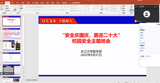 (通讯员:黄柏青 孟鑫)按照长江大学学生工作部统一部署,2022年9月27日,医学部在全部范围内召开了“安全庆国庆、喜迎二十大”校园安全主题班会。