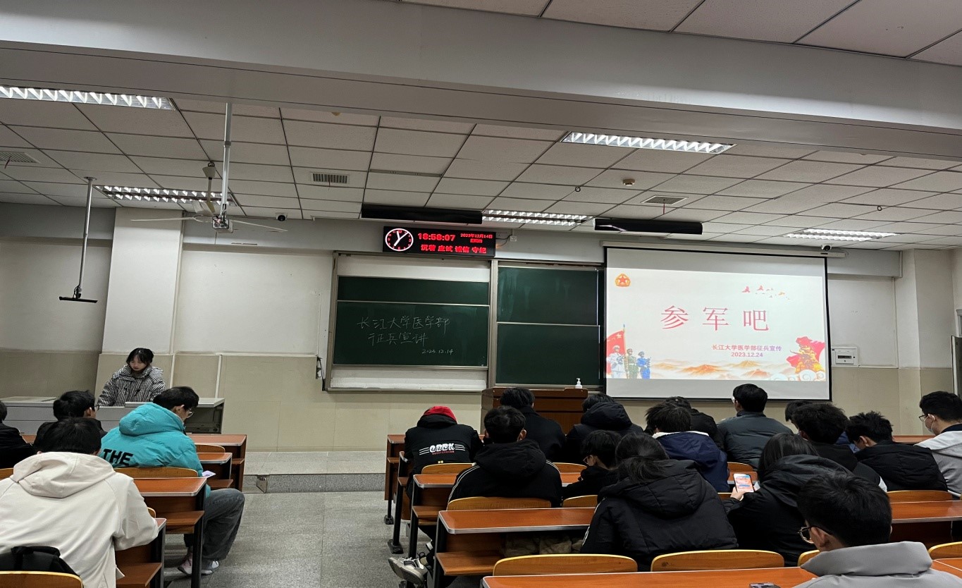 为加强征兵政策宣传,普及国防知识,强化国防教育,深入做好2023年度大学生征兵工作,医学部于12月14日晚7时在12教201举行了2023年征兵宣讲会,120多名本科学生参加。