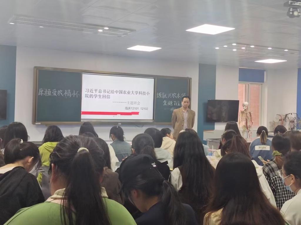(通讯员 刘伟、曾芝琳)为进一步学习贯彻习近平总书记给中国农业大学科技小院的同学们回信精神,5月7日医学部组织了“厚植爱农情怀,练就兴农本领“主题班会,领会回信的核心要义和精神内涵。医学部全体学习小组成员、班主任和本科生参与本次学习,通过读回信原文、视频观看和讨论等方式,确保学习教育活动入脑入心,培养青年学生担当奉献精神。