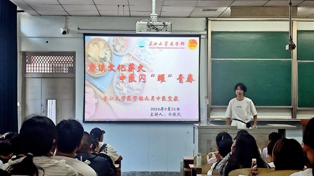 (通讯员:齐俊杰 邹熊子怡)传承岐黄之术,绽放杏林春暖。习近平总书记曾指出:“中医药学是中国古代科学的瑰宝,也是打开中华文明宝库的钥匙。”为深入学习贯彻习近平总书记重要讲话精神,充分展现医学部专业特色、打造医学专业亮点,为同学们科普基础的中医知识,医学部于2024年9月21日在东校区13号教学楼成功举办了一场精彩纷呈的中医药健康知识宣讲活动。