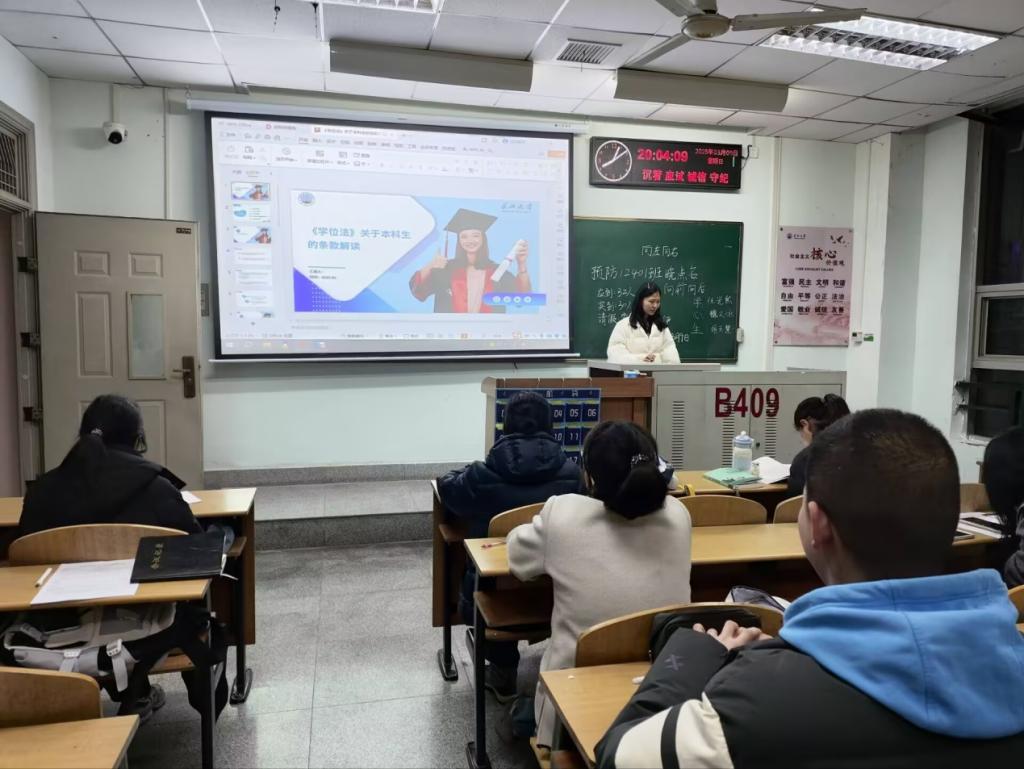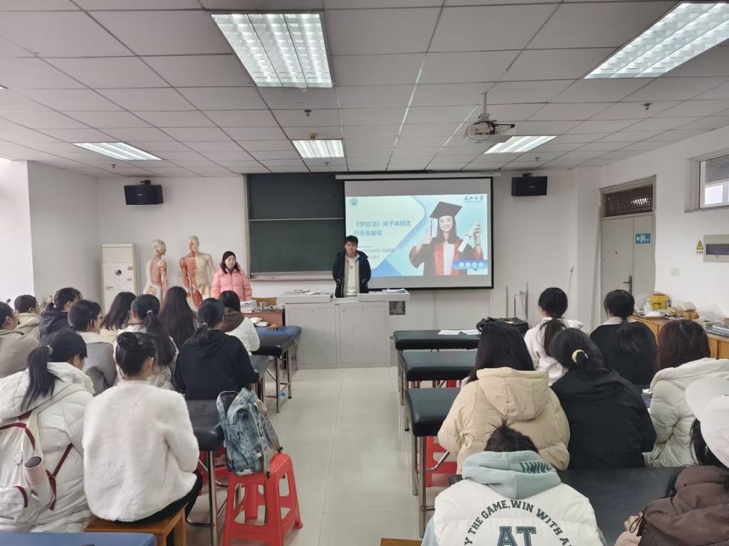 医学部精心策划,以主题班会形式推进学习。各班班主任在班会中详细讲解《学位法》的制定背景、发展历程与核心条款都进行了深入浅出的阐释。同时,各班结合实际案例,如学术不端导致学位撤销等,让同学们深刻认识到《学位法》的严肃性与权威性。