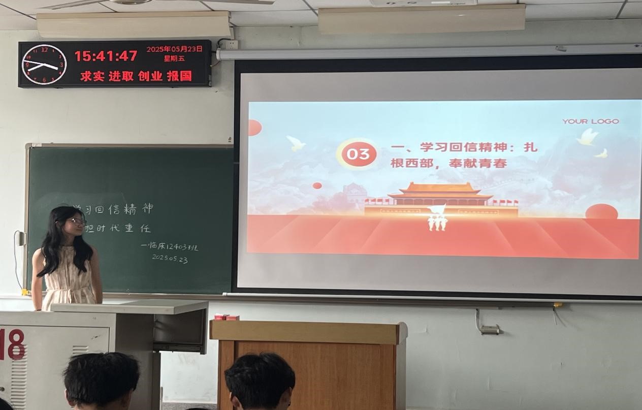 为深入学习贯彻党的二十届三中全会精神,紧跟时代步伐,敏锐捕捉时政热点,引导广大团员青年关注国家大事、国际形势,培养家国情怀与全球视野。促使基层团组织紧密围绕当下时政焦点,帮助团员青年深刻理解时政热点背后的内涵与意义,提升政治素养和分析问题的能力,激励广大团员在时代浪潮中坚定理想信念,勇担历史使命,为实现中华民族伟大复兴的中国梦贡献青春智慧和力量。2025年5月25日医学部全体学生开展了“学习回信精神 勇担时代重任”的主题教育实践活动。