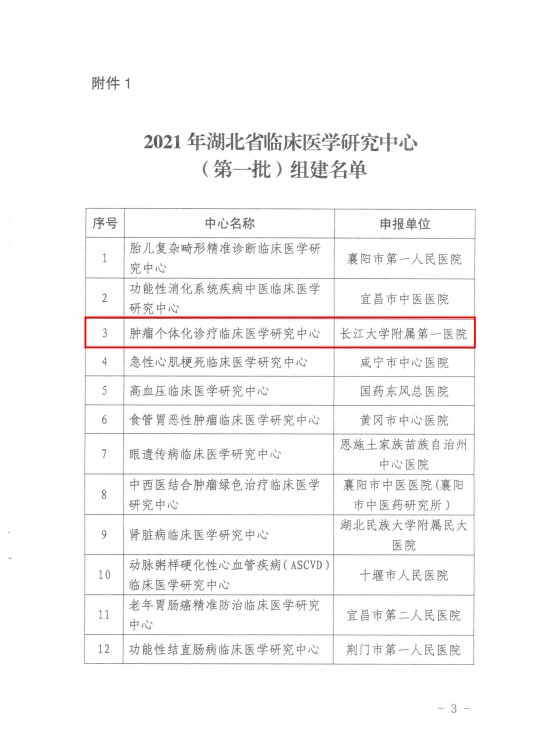 2022年5月,长江大学“湖北省肿瘤个体化诊疗临床医学研究中心”正式成立,该省级临床医学研究中心依托长江大学附属荆州第一人民医院建设,是湖北省科技厅和湖北省卫健委为加强医学科技创新体系建设,经荆州市科技局推荐并申报获批的省级临床医学和转化研究的高地。作为荆州市三甲医院第一家省级临床医学研究中心,中心在研究方向上聚焦:针对常见、多发肿瘤的筛查及早期诊断,开展肿瘤标记物的挖掘;针对复发、转移和难治性晚期肿瘤开展个体化诊疗的基础与临床研究;引进及开发新技术,开展干细胞及免疫细胞技术等前沿性研究工作,促进科研成果的临床转化与推广。