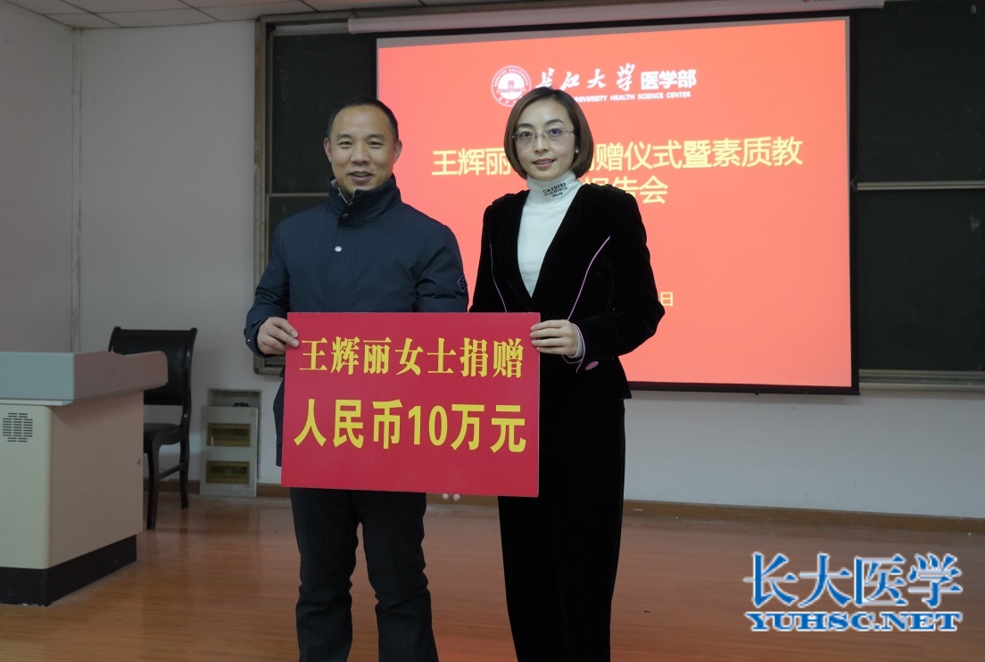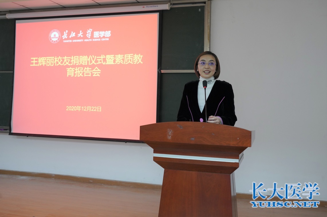 捐赠仪式上,孙启军处长为优秀校友回归母校致欢迎辞,王辉丽校友向母校长江大学捐赠10万元用于母校医学教育发展建设,医学部常务副部长龚权代表学校接受赠与,医学部党委书记关辉为王辉丽女士颁发捐赠证书。